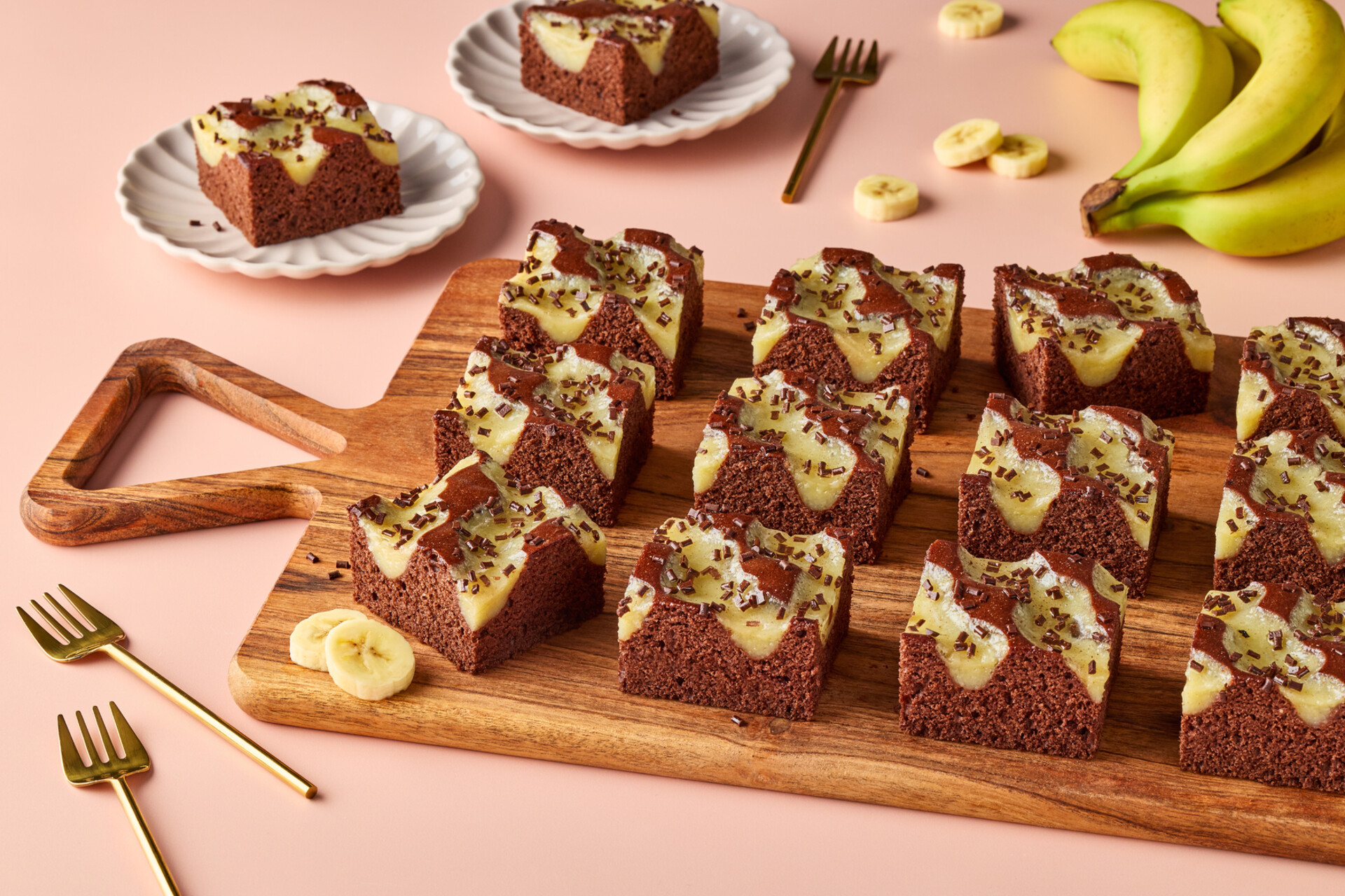 Schoko und Banane, eine köstliche Kombi, die ab Februar 2026 das Blechkuchen-Sortiment von Dr. Oetker Professional aufmischt! Beim Schoko-Bananen-Kuchen trifft eine fruchtige Bananen-Füllung auf feinen Schoko-Kuchen. Getoppt mit Schokostreuseln spricht die neue Variante alle Kuchen-Fans an, die mehr wollen als übliche Klassiker.